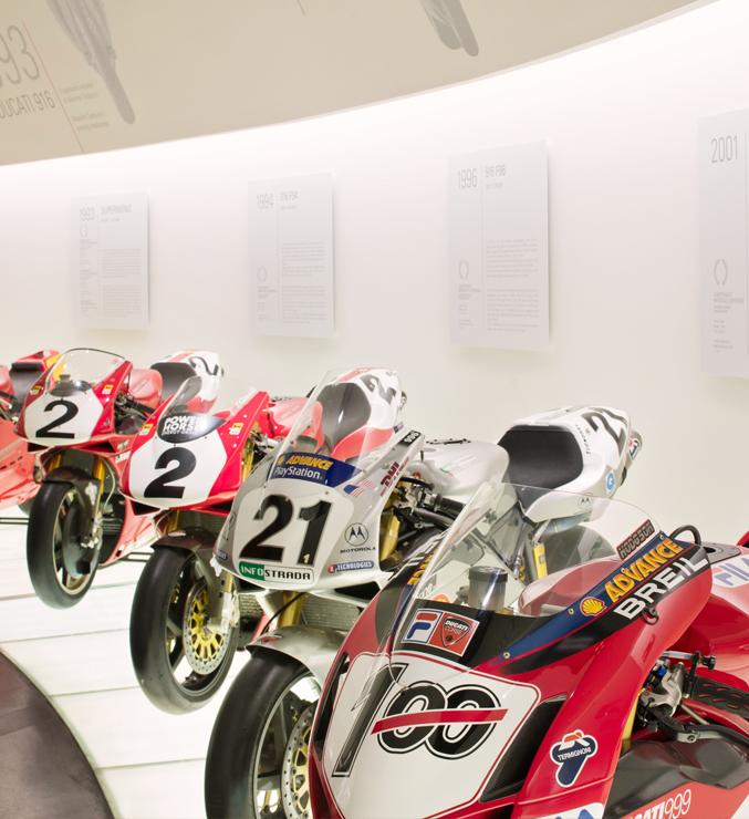 Nel museo potrai ammirare i venti modelli di moto stradali più iconici che hanno fatto grande la storia dell’azienda oltre ad una ricca collezione di moto da corsa. Ogni modello racconta una vittoria e un pilota il cui nome rimarrà scritto nell’albo d’oro Ducati. La sezione del museo è completata da una esposizione di trofei e tute appartenuti a quattro di questi grandi campioni.